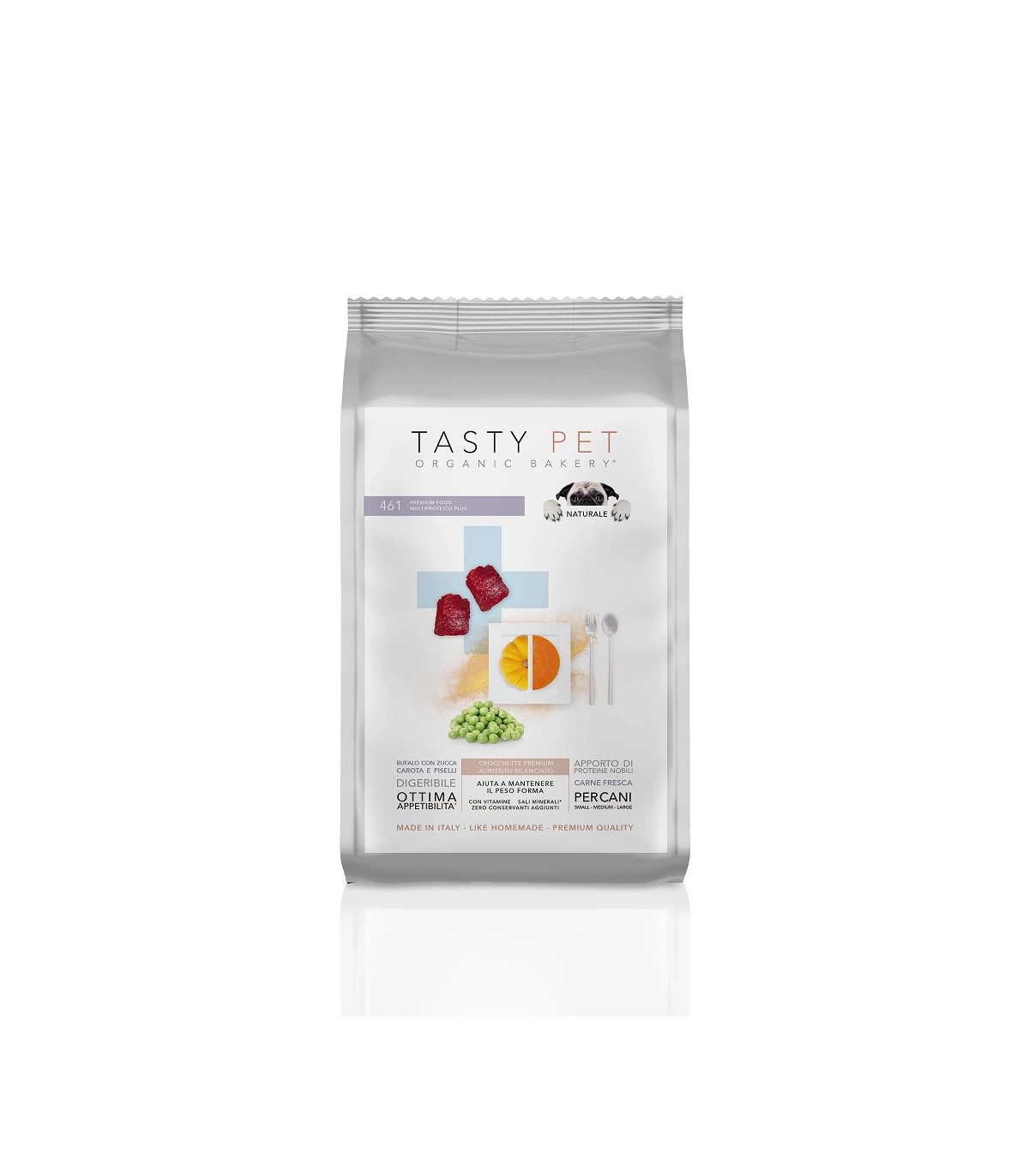 \xc3\x89 composto da ingredienti naturali che assicurano un contributo rilevante di vitamine B - B6 - B9 - B12 importanti per la salute della pelle, del pelo e del tono muscolare. Ricco di vitamina C cheè un antiossidante dalle proprietà antinfiammatorie. Contiene potassio, zinco, ferro, selenio e fosforo, minerali preziosi per il buon funzionamento intestinale. Il calcio e il magnesio sono molto importanti per ossa e denti. Contiene Omega 3 importante per la salute dell'apparato cardiovascolare. \xc3\x89 un alimento che assicura una nutrizione completa del cane, a basso contenuto calorico contribuisce anche al mantenimento del peso forma. La carne magra di alta qualità e di elevato valore proteico aiuta a regolare l'intestino e aumenta le difese immunitarie. La carne di bufaloè molto magra, ricca dei nutrienti principaliè una fonte di vitamine B6-B12 e contiene magnesio e potassio. Questa carne abbassa il colesterolo dando un giusto apporto di proteine ed una elevata presenza di ferro, minerale essenziale per la salute dell'organismo del cane.