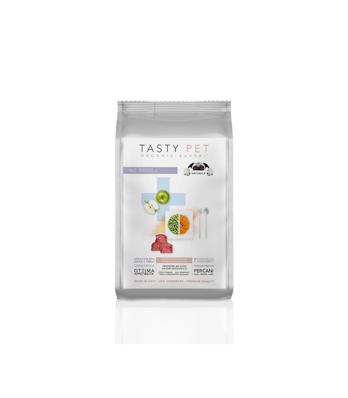Agnello (25%), Piselli (10%), Mela, Carota, Patate, Polpa di barbabietola (1%), Mais Integrale, Riso integrale, Farinaccio di Grano, Strutto di maiale, Lievito di birra disidratato (1%), Semi di lino, F.O.S (0,1%), M.O.S (0,1), Yucca schidigera, Sostanze minerali.