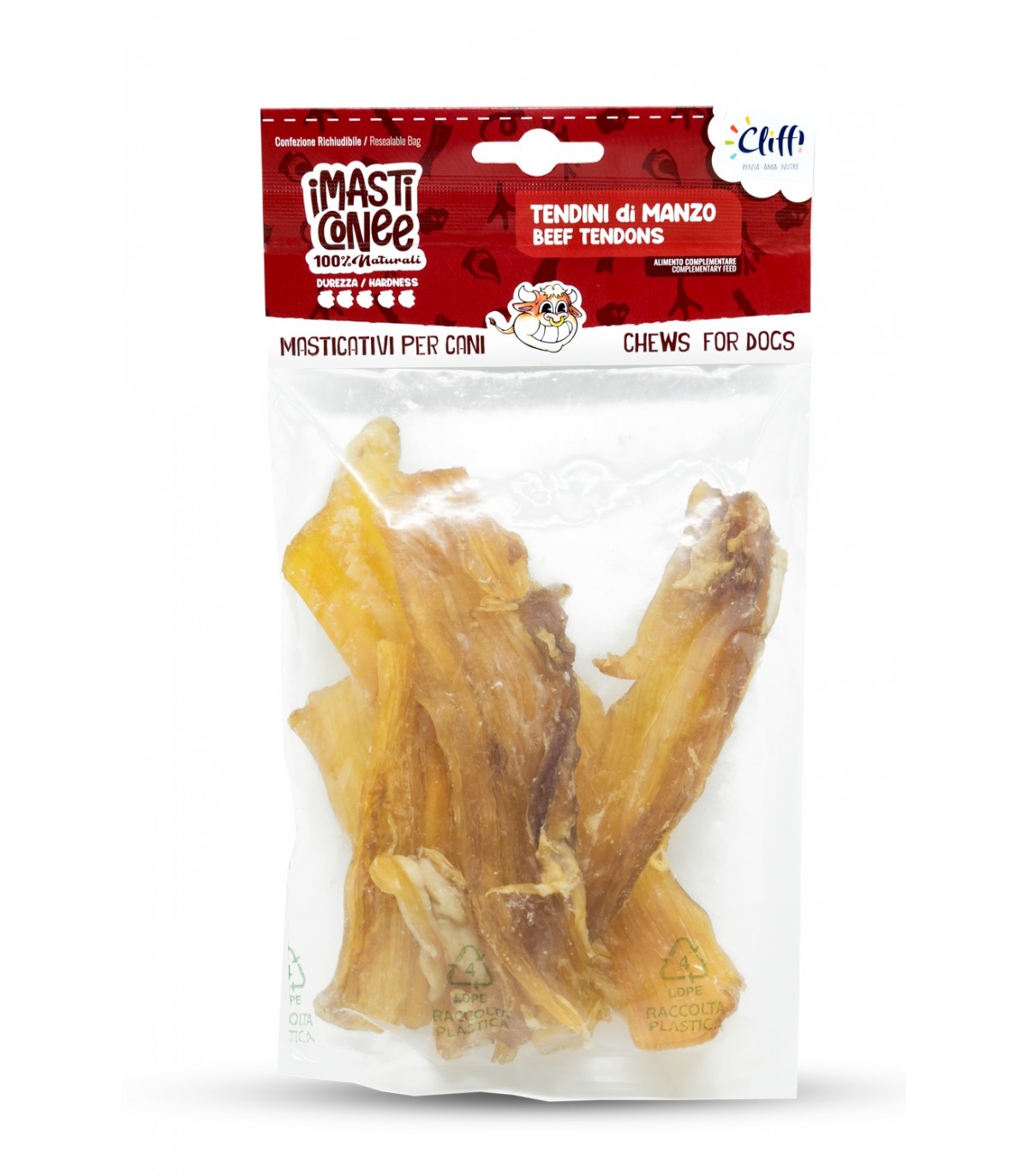 COMPOSIZIONE: Tendini di manzo essiccati. 100% Manzo. Non contiene additivi.