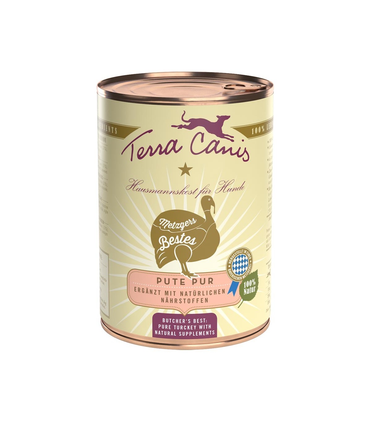 Gli alimenti complementari Terra Canis linea BUTCHER'S BEST sono formulati per tutti i cani adulti, sono monoproteici, grain free e lactose free, un'alternativa pratica per la dieta a base di carne cruda e un valido sostituto della dieta B.A.R.F. in vacanza o in viaggio. Gli alimenti complementari umidi Terra Canis vengono preparati in una macelleria tradizionale di Monaco. Tutti gli ingredienti sono Human Grade al 100%.