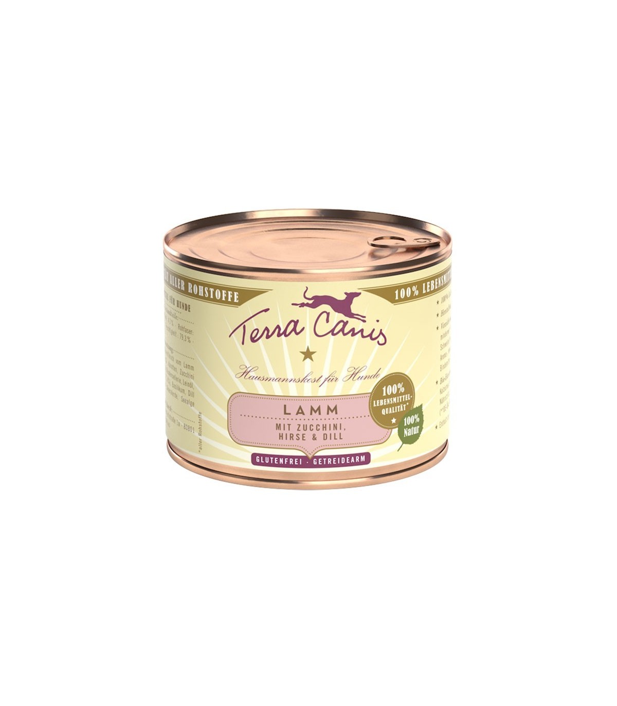 Ingredienti: cuore di agnello (20%), muscolo di agnello (18%), polmone di agnello (10%), carote, zucchine (13%), miglio (8%), mela, gambo di sedano, olio di lino, lievito di birra, guscio d'uovo in polvere (0,4%), basilico, aneto (0,2%), seme di finocchio, argilla, alga marina (0,13%), polline
