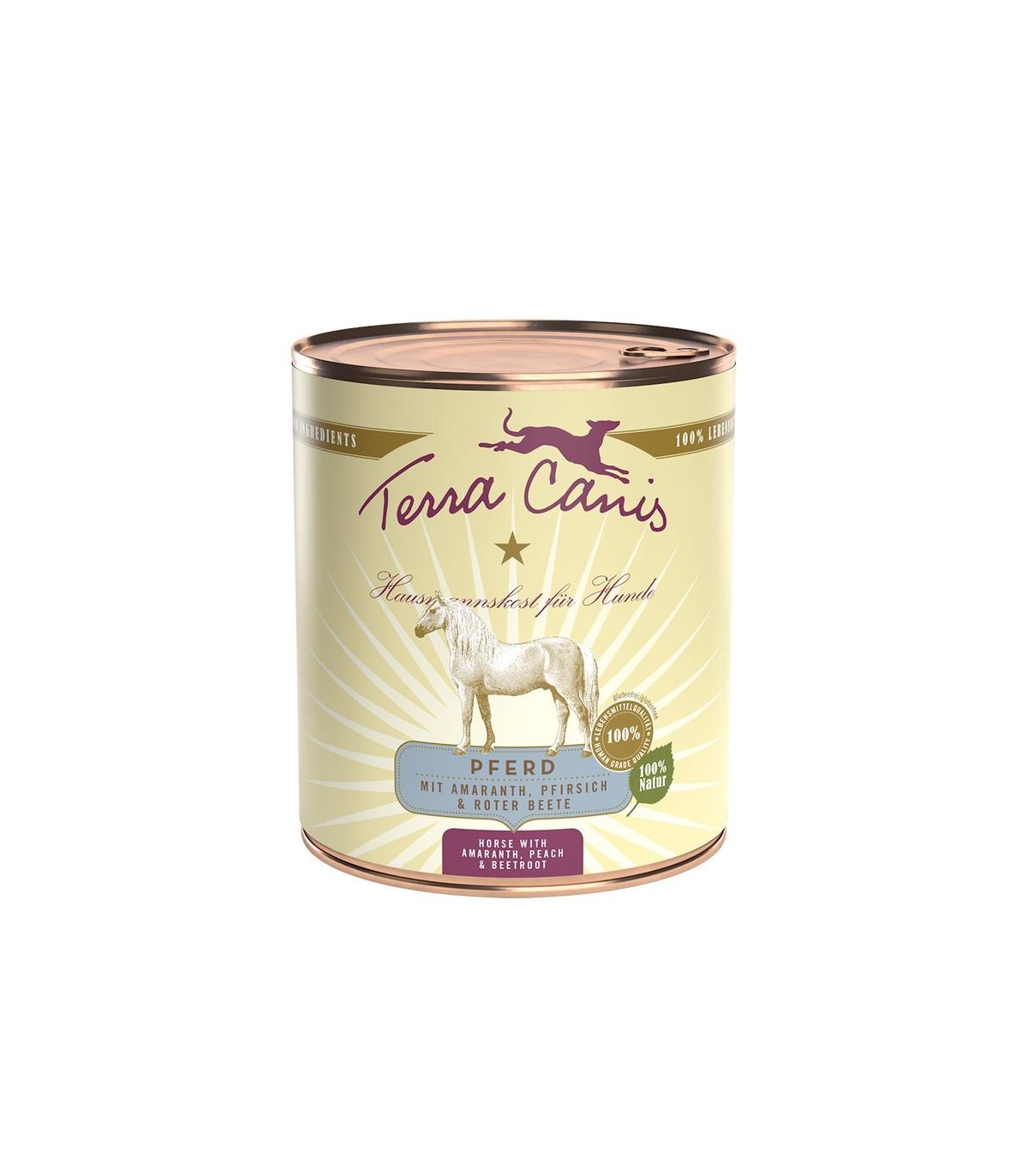 Ingredienti: carne di muscolo di cavallo (52%), carota, sedano, amaranto (7,5%), finocchio, mela, pesca (5%), barbacbietole (3%), olio di lino, lievito di birra (0,4%), guscio d'uovo in polvere (0,3%), timo, alga marina (0,15%), erba cipollina, bacche di olivello spinoso, sale delle Ande, argilla
