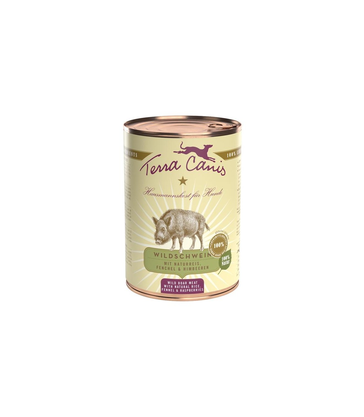 Ingredienti: carne di muscolo di cinghiale (60%), riso integrale (7%), zucchino, finocchio (4%), pomodoro (3%), albicocca, mela, melone giallo (4%), lampone (3%), borragine, lupino (2%), olio di lino, seme di sesamo, timo, salvia (0,3%), maggiorana, argilla, alga marina (0,2%), lievito di birra, guscio d'uovo in polvere (0,5%), olio di fegato di merluzzo