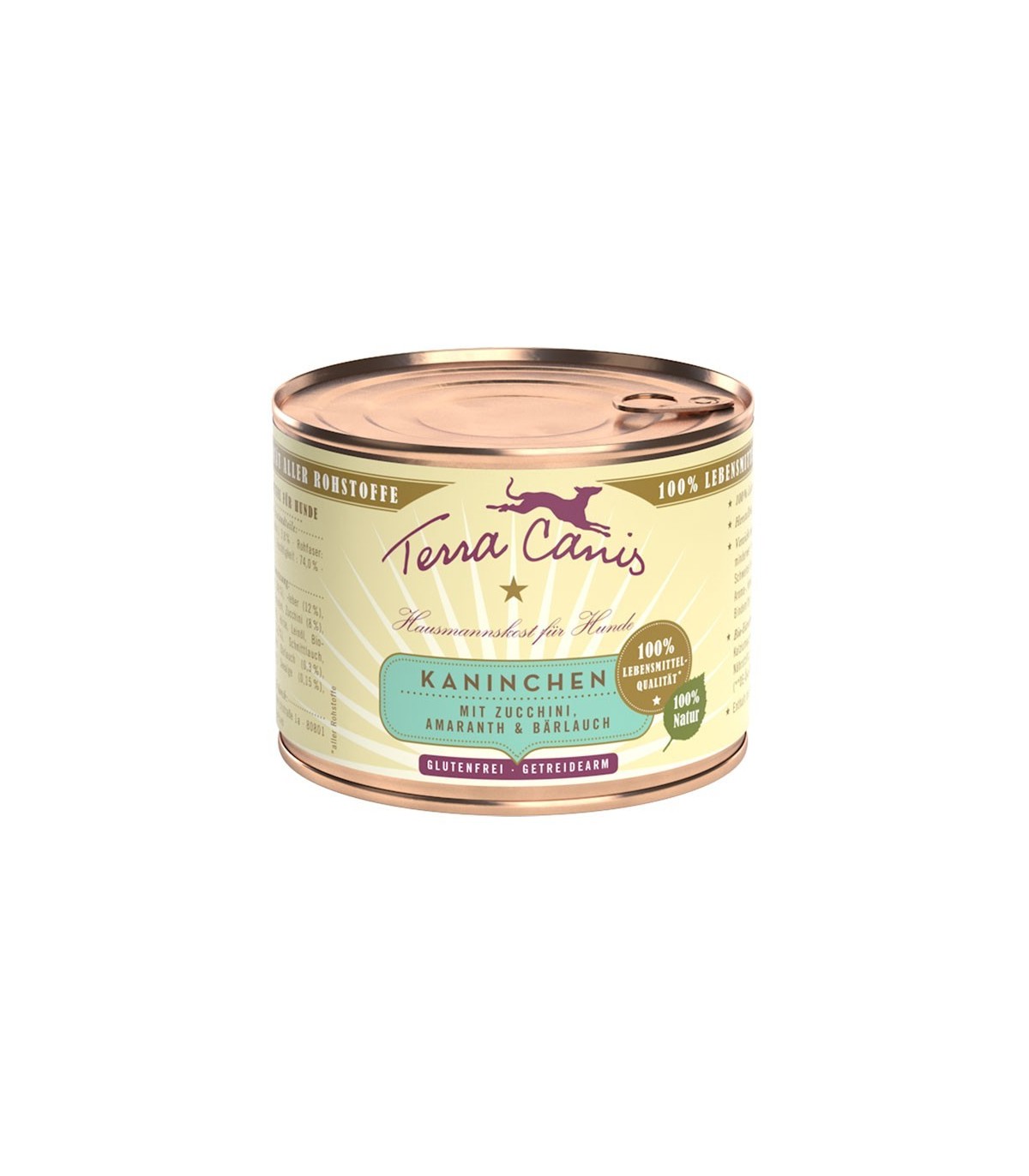 Ingredienti: muscolo di coniglio (30%), fegato di tacchino (26%), zucca, pomodoro, zucchina (7%), sedano, miglio, amacranto (4%), olio di lino, guscio d'uovo in polvere (0,5%), lievito di birra, aglio orsino (0,2%), erba cipollina, seme di lino macicnato, argilla, sale delle Ande, alga marina (0,15%), polline