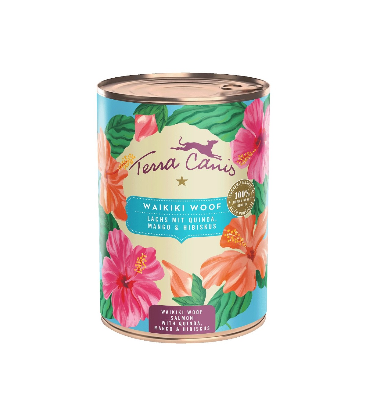 Pawloha! Le Hawaii sono un regalo per tutti i sensi che il TERRA CANIS FLOWER WAIKIKI WOOF SALMONE 400G racchiudeal suointerno. Nel rispetto della cucina hawaiana, la fonte proteica è salmone, abbinato a verdure fresche, quinoa, mango e ananas. Altri ingredienti sono l’olio di colza, la farina di cocco ed un mix di spezie. Per completare la ricetta la Terra Canis ha aggiunto l'ibisco, il fiore nazionale hawaiano.