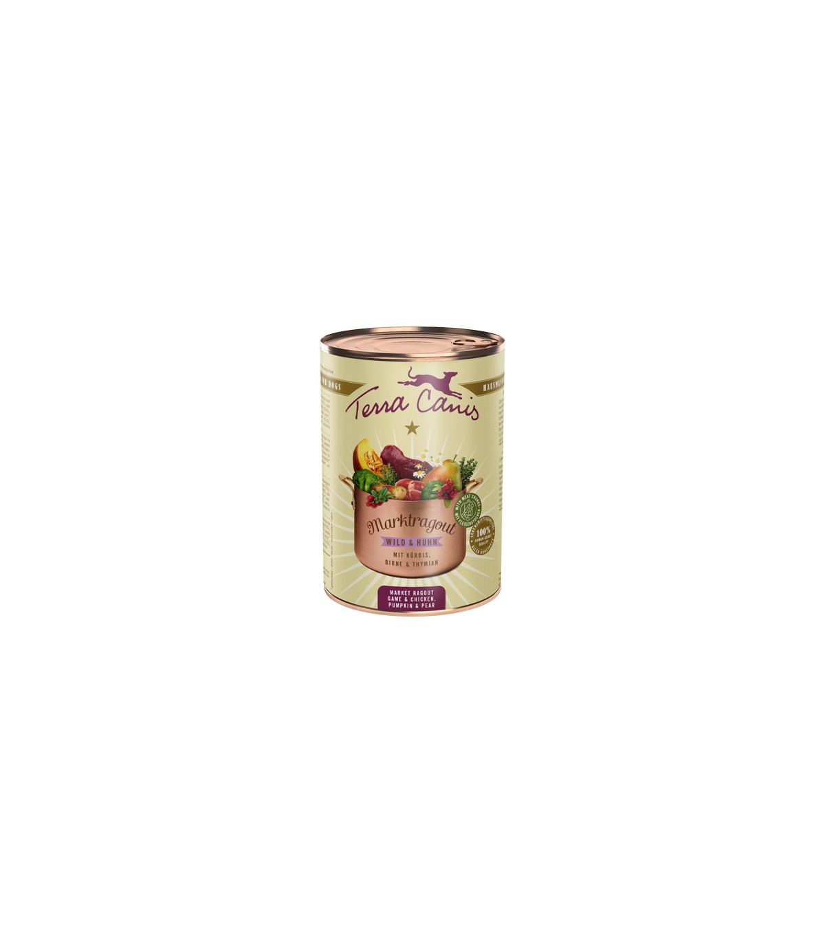 Cuori di pollo(34%),muscolo di selvaggina (carnepergulasch)(27%),zucca(10%),patata(7%),pera(5%),broccoli(5%),pomodoro, patata dolce, mirtillo rosso(0,4%), olio di colza, cocco grattugiato, lievito di birra*, guscio d'ostrica*, acerola*, dente di leone*, camomilla*(0,1%),timo*(0,1%),santoreggia*(0,1%),argilla*,sale delle Ande, alghe marine*, minerali