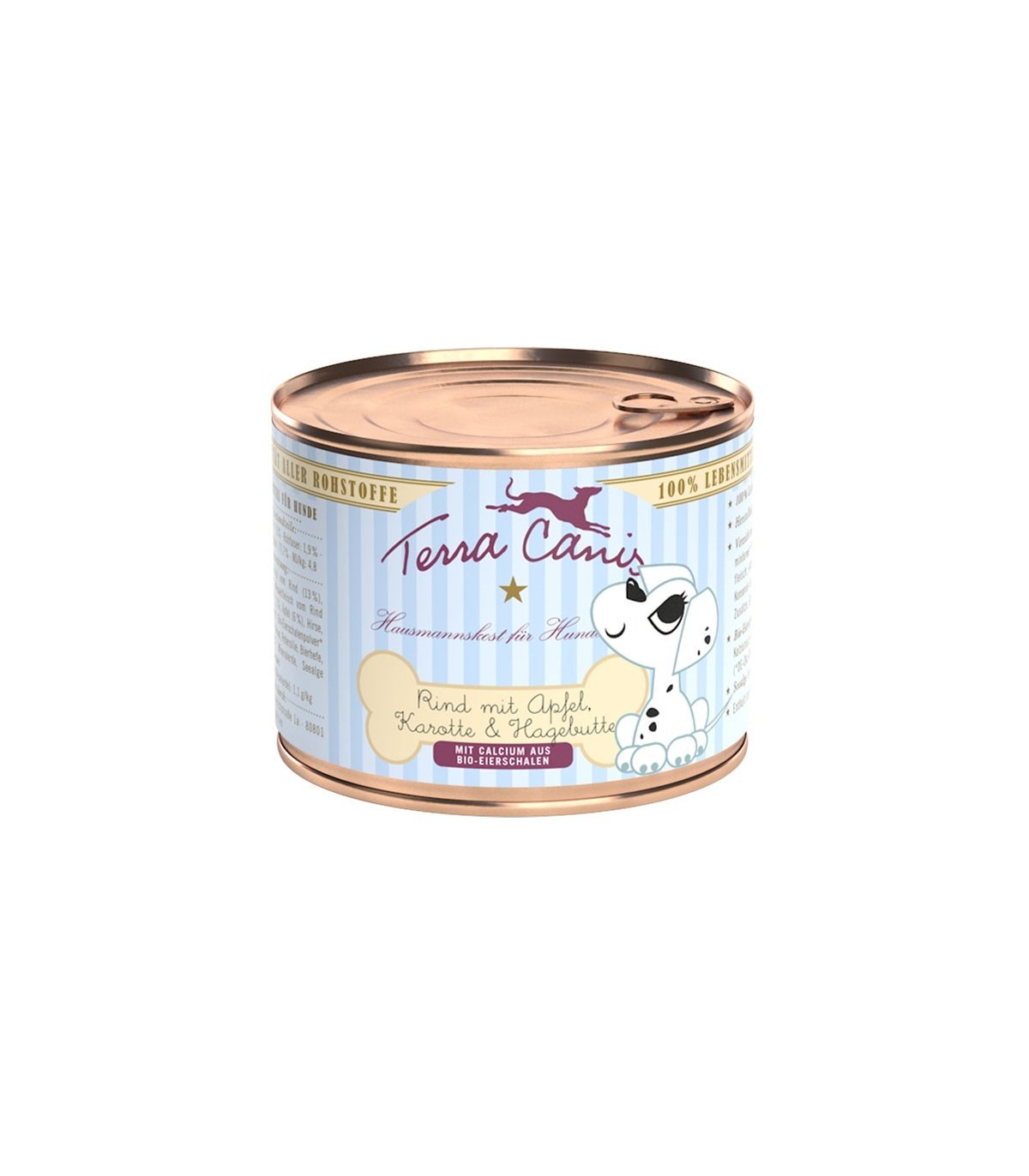Gli alimenti completi Terra Canis Puppy contengono una percentuale più elevata di guscio d'uovo in polvere in modo che i cuccioli ricevano abbastanza calcio naturale nella fase di crescita. Le formulazioni considerando ingredienti freschi, polline ed alghe forniscono al corpo il fabbisogno giornaliero in termini di vitamine, minerali, oligoelementi, enzimi, aminoacidi essenziali e acidi grassi insaturi naturali. La Terra Canis ha fissato la percentuale di cereali tra lo 0 ed il 6%.