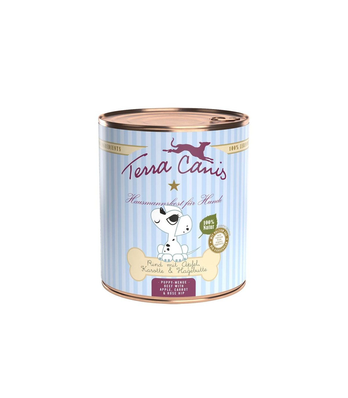 Gli alimenti completi Terra Canis Puppy contengono una percentuale più elevata di guscio d'uovo in polvere in modo che i cuccioli ricevano abbastanza calcio naturale nella fase di crescita. Le formulazioni considerando ingredienti freschi, polline ed alghe forniscono al corpo il fabbisogno giornaliero in termini di vitamine, minerali, oligoelementi, enzimi, aminoacidi essenziali e acidi grassi insaturi naturali. La Terra Canis ha fissato la percentuale di cereali tra lo 0 ed il 6%.