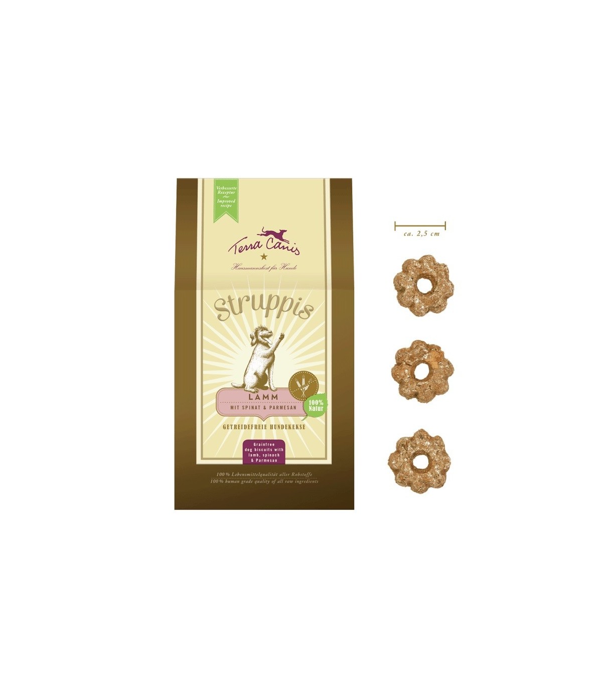 La percentuale di carne di muscolo degli STRUPPISè stata aumentata dal 5% al 25%, mentre le farine di spelta e avena sono state sostituite dalle patate, rendendo questo snack anche grain-free e quindi adatto a cani con intolleranze ai cereali/al glutine ovvero a cani con problemi di digestione. Senza contare che gli STRUPPIS contengono tanta sana frutta e verdura, così come erbe speciali quali melissa, malva, fiori di sambuco, bacche di olivello spinoso, tarassaco e molte altre. Hanno un aspetto delizioso e il loro profumoè oltremodo invitante, come quello dei biscotti per cani fatti in casa.