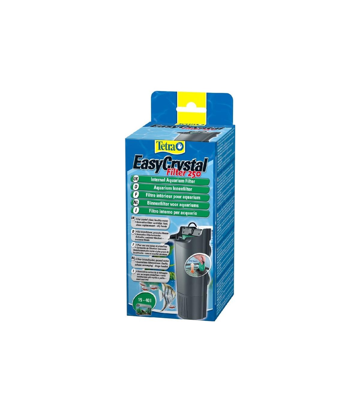 -il filtro assicura un'acqua chiara, cristallina e sana, grazie al suo intenso filtraggio meccanico, biologico e chimico -filtraggio meccanico: lana grezza filtrante a doppio strato, rimuove efficacemente anche le particelle più piccole. Lato bianco = pre-filtro per particelle più grosse, lato verde = filtro fine -filtraggio biologico: spugna filtrante e sfere biofiltranti con superficie di ampie dimensioni sulla quale proliferano i batteri benefici -filtraggio chimico: uno speciale carbone attivo elimina l'intorbidamento dell'acqua e i cattivi odori -la pulizia del filtro EasyCrystal®è estremamente semplice: sostituire la cartuccia filtrante ogni 4 settimane. Non serve lavare l'elemento filtrante, niente più mani bagnate! -flusso elevato d'acqua: turbina magnetica ad alta potenza -salva spazio: custodia compatta -collocazione flessibile: ventose di lunga durata -adatto per acquari da 15 a 40 l -omologato T\xc3\x9cV/GS -2 anni di garanzia