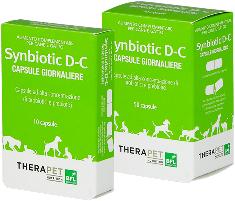 Le capsule SYNBIOTIC D-C contengono il Prebiotico Preplex e il ProbioticoEnterococcus faecium (DSM 10663/NCIMB 10415) 4b1707 1x1013 CFU/Kg; 2x109CFU/capsula ad alta concentrazione, che in sinergia riequilibrano rapidamente la microflora intestinale. Regolarizzano la digestione, normalizzano le feci, riportano il cane ad essere vitale e attivo in poco tempo. Gli studi clinici dimostrano come aiuti a prevenire del 50% la diarrea indotta da stress o da terapie invasive come la chemioterapia (doxorubicina).