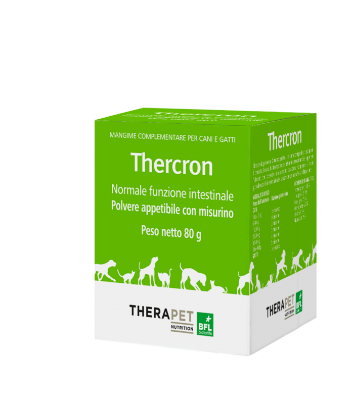 THERCRON è un mangime complementare formulato per favorire la normale funzione dell' intestino nel cane e nel gatto di ogni etè. La formulazione in polvere consente una facile somministrazione quotidiana; l' elevata appetibilitè garantisce il gradimento e l' utilizzo da parte dell' animale per lunghi periodi.
