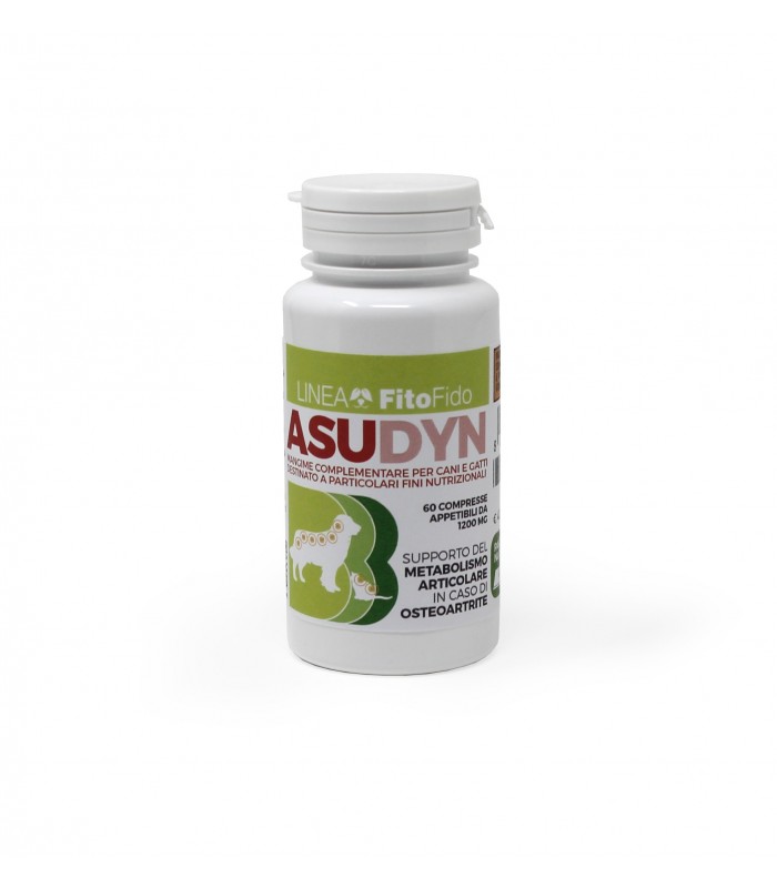 ASUDYN mangime complementare destinato a particolari fini nutrizionali in compresse divisibili da 1200 mg, è particolarmente indicato come supporto del metabolismo articolare in caso di osteoartrite nel cane e nel gatto. La formulazione di ASUDYN risulta di facile somministrazione ed elevata appetibilità. ASUDYN è particolarmente indicato anche in soggetti anziani o in soggetti sportivi, sottoposti ad elevato sforzo fisico.