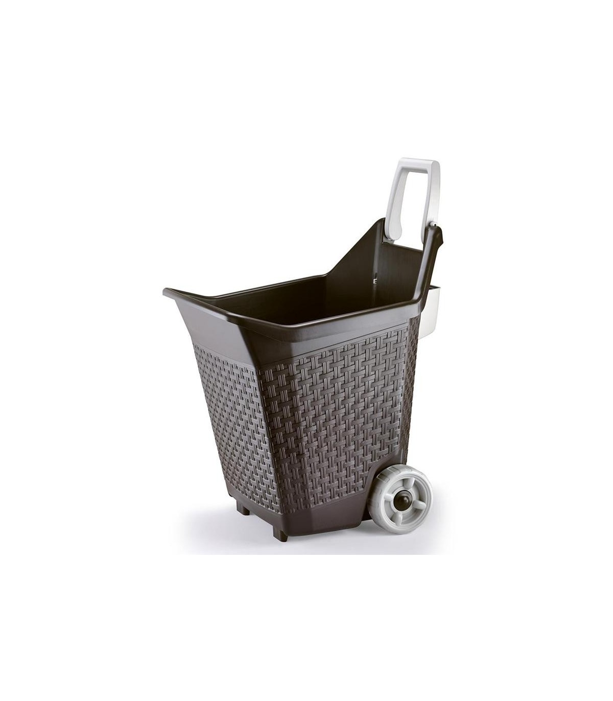 Carriola della capacità di 76lt ideale per i lavori da giardino o nell'allevamento per distribuire cibo agli animali. Dotato di ruote, maniglia pieghevole e tasca porta oggetti Design simil paglia, portata massima 60 kg.