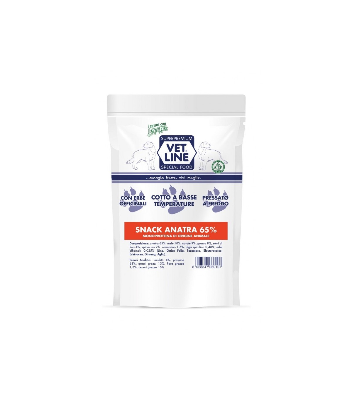 Anatra 65%, mele 10%, carote 9%, grasso 8%, semi di lino 4%, spinacina 2%, rosmarino 1,5%, alga spirulina 0,48%, erbe officinali 0,025% (Lino, Ortica Folia, Tarassaco, Eleuterococco, Echinacea, Ginseng, Aglio).