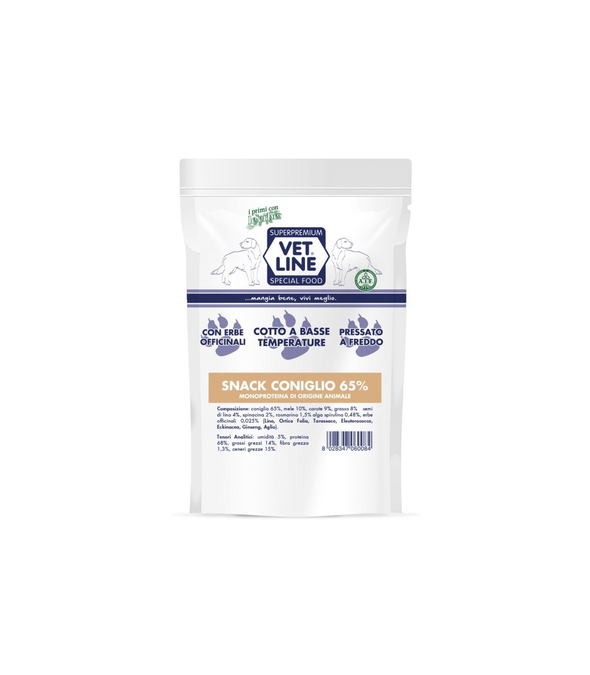 Coniglio 65%, mele 10%, carote 9%, grasso 8%, semi di lino 4%, spinacina 2%, rosmarino 1,5%, alga spirulina 0,48%, erbe officinali 0,025% (Lino, Ortica Folia, Tarassaco, Eleuterococco, Echinacea, Ginseng, Aglio).