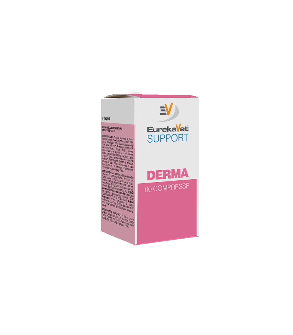 EurekaVet Support derma 60 compresse è un supplemento nutrizionale studiato per compensare in modo completo tutte le carenze nutrizionali che sono alla base di stati di ipersensibilità cutanea e stati patologici della cute e del pelo.