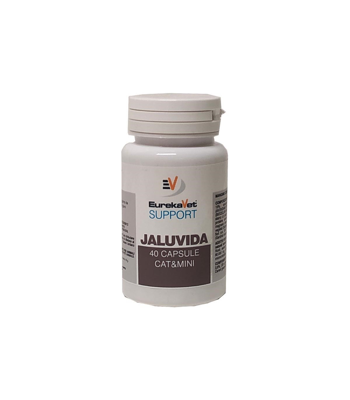 EurekaVet Support jaluvida cat & mini 40 capsule 400 mgè un prodotto a base di Acido ialuronico ad alto peso molecolare, Avovida (ASU) e un fitocomplesso a base di Boswelia S., Salix A. e Garcinia M.