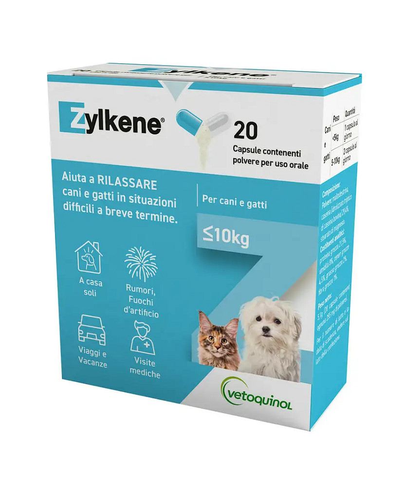 Zylkène è disponibile in scatole da 20 capsule in blister nelle 3 referenze 75 mg, 225 mg e 450 mg, in base al peso dell’animale.