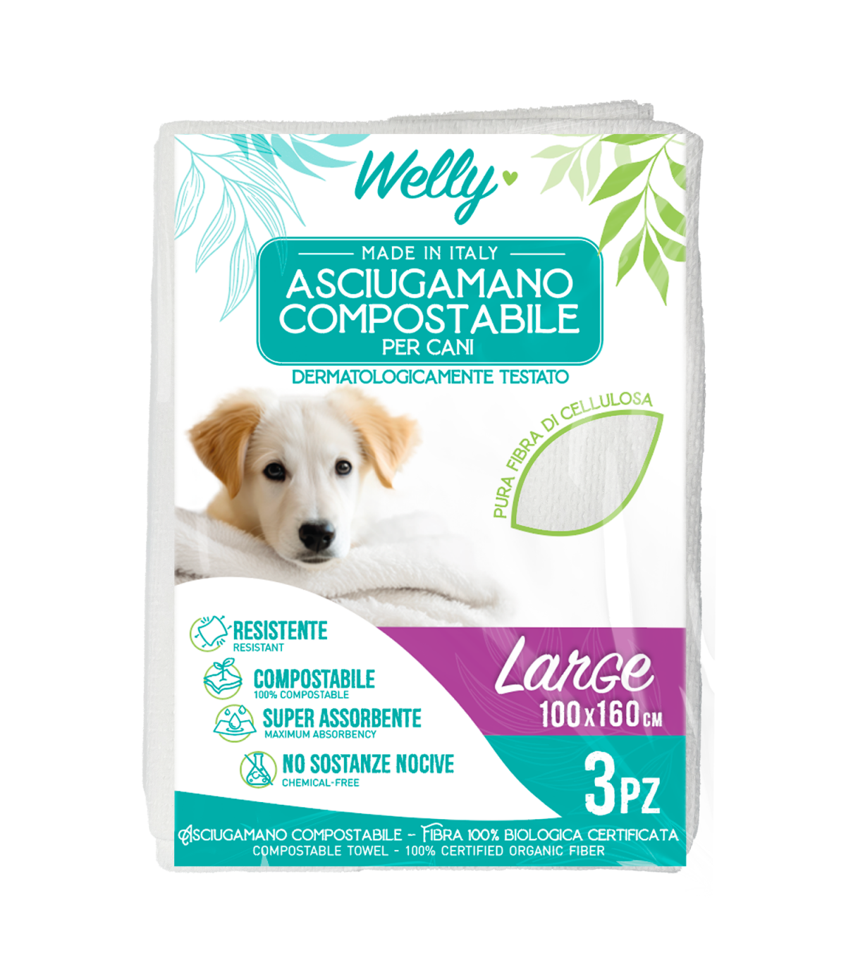 Welly™ Asciugamano Compostabile è la soluzione igienica e pratica per asciugare il tuo Pet: un panno 100% composto in viscosa di fibre di cellulosa, biodegradabile e compostabile; estremamente morbido, Welly™ Asciugamano Compostabile è privo di sostanze nocive e collanti.
