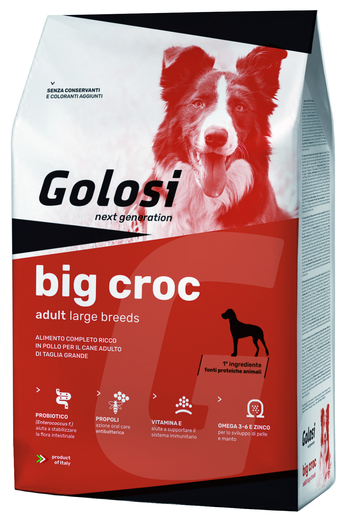 Golosi big croc è la soluzione nutrizionale ideale per il cane adulto di taglia grande, spesso molto vorace, che necessita di una crocchetta che favorisca la corretta deglutizione, fondamentale per una buona digestione. Il pollo, leggero e povero di grassi, è ideale per fronteggiare il rischio di eccessivo aumento di peso che graverebbe sulla struttura scheletrica. L’integrazione di glucosamina e condroitina aiuta inoltre a supportare le articolazioni impegnate a sostenere una notevole massa corporea.